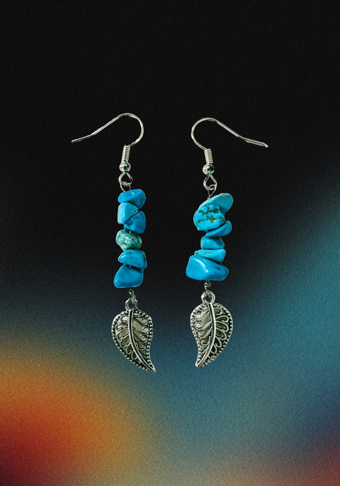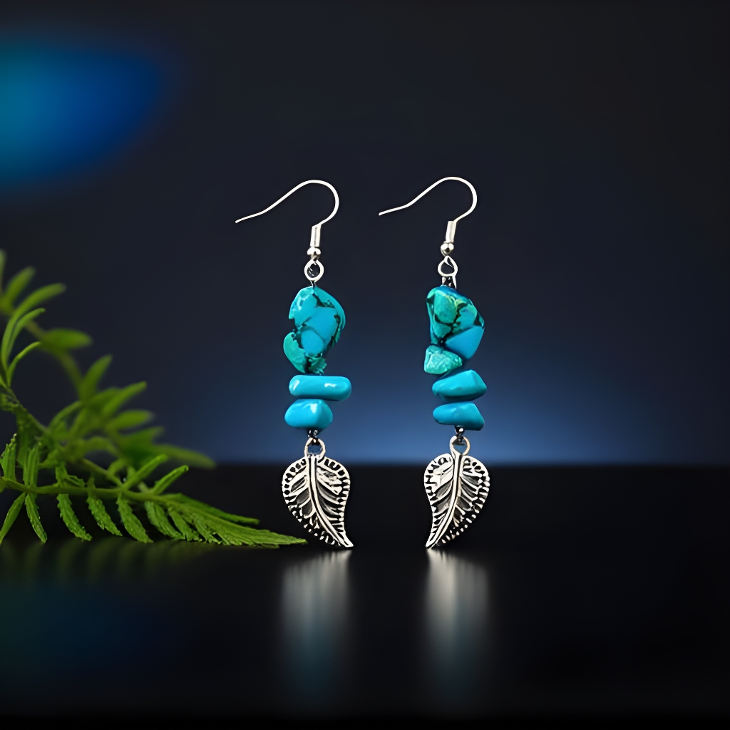 Imagine a serene forest where sunlight dances through lush foliage, casting a glow on dew-kissed turquoise leaves. Our artisans draw inspiration from this tranquil scene, meticulously crafting each earring to mirror the natural world’s effortless grace. The genuine turquoise chips evoke the rich hues of nature’s most calming elements, while the silver leaf accents add a whisper of sophisticated charm and modern design.